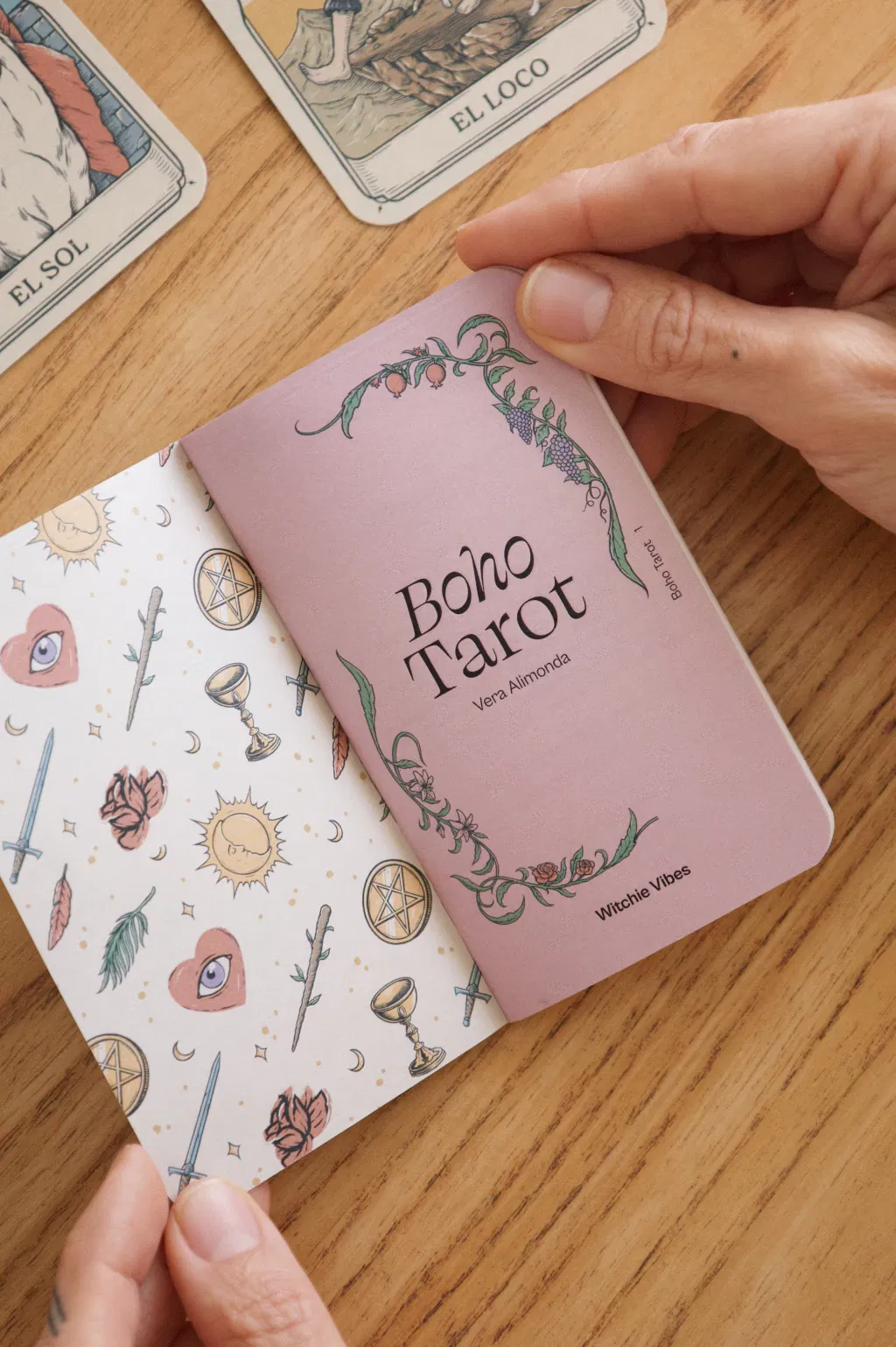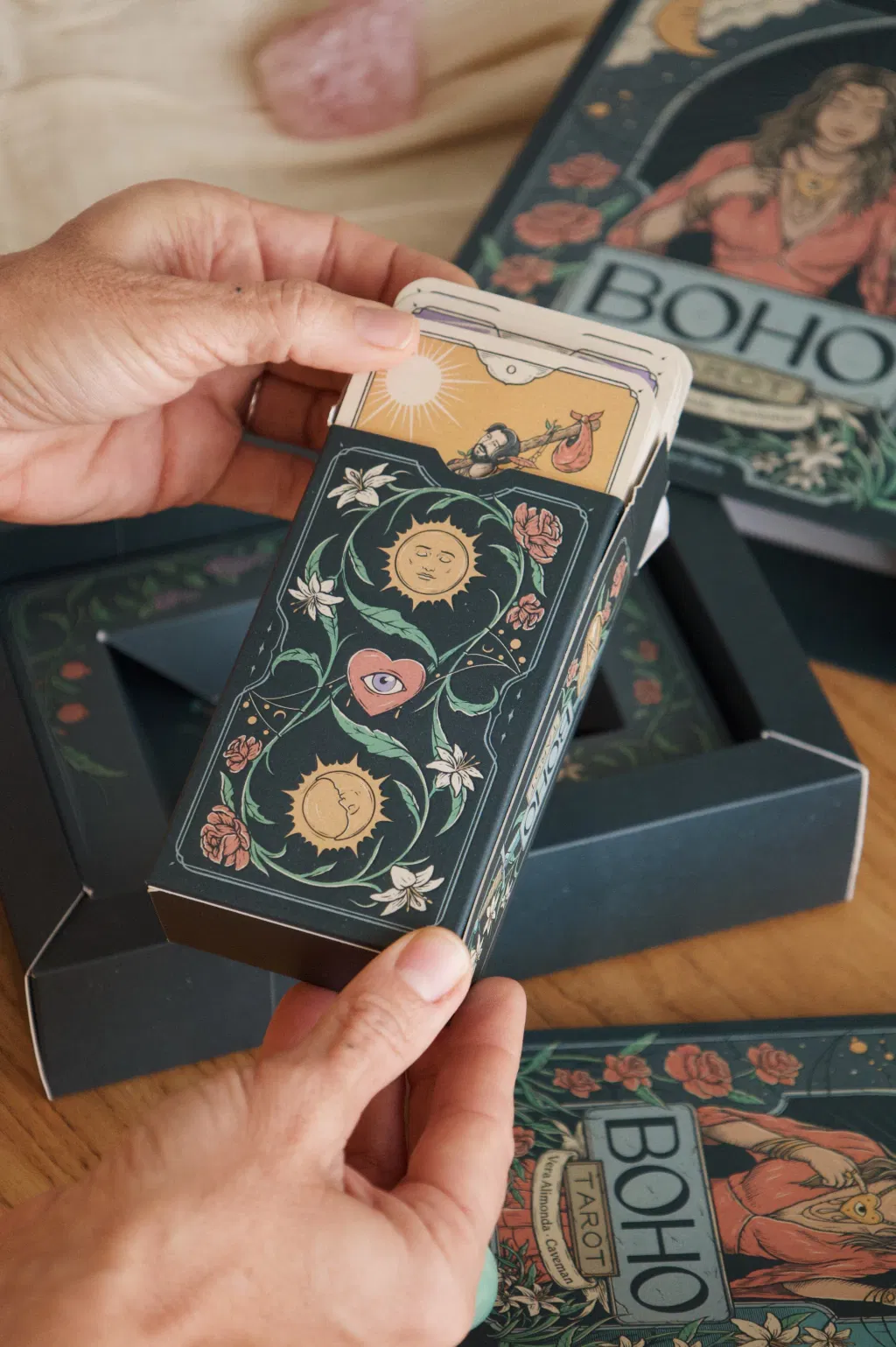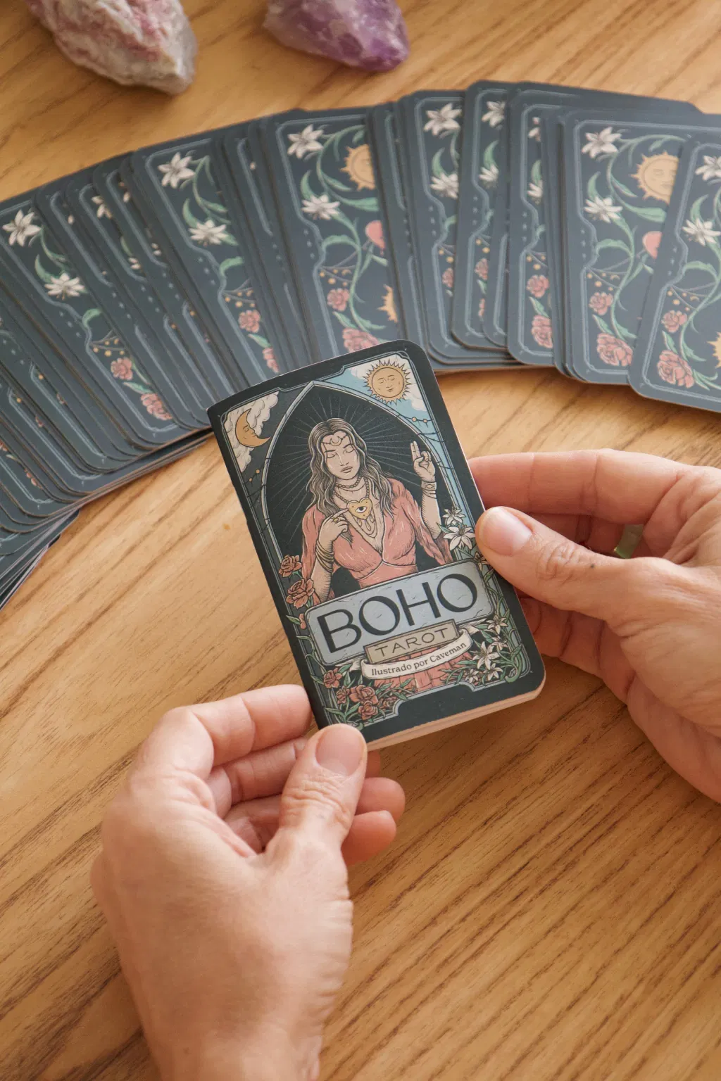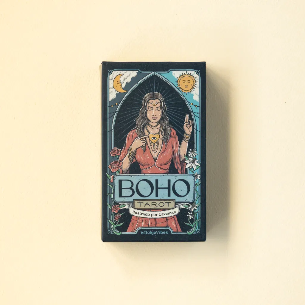 Boho Tarot es una relectura contemporánea del tarot clásico, inspirada en el mazo Rider creado por Pamela Colman Smith. Con estética bohemia y una profunda sensibilidad venusina, este mazo fusiona símbolos antiguos con una narrativa visual moderna, cálida e intuitiva.