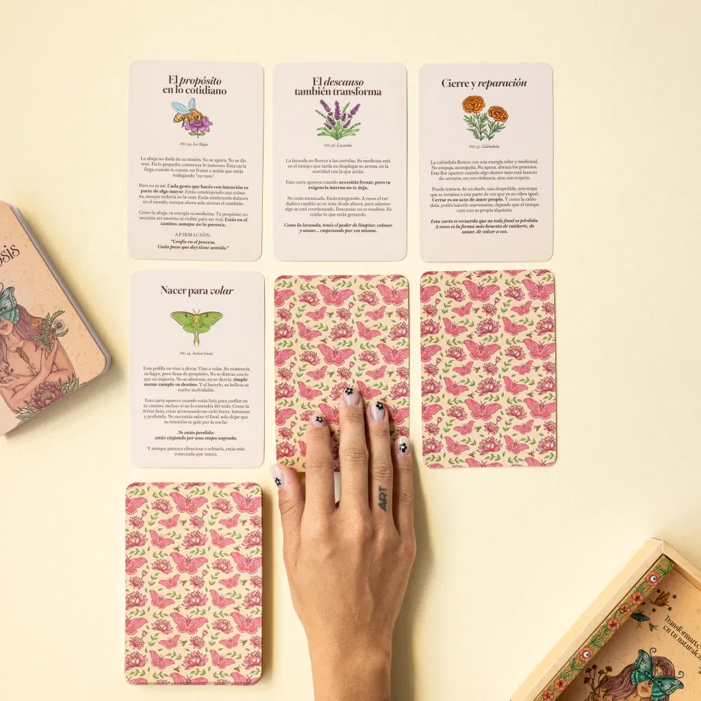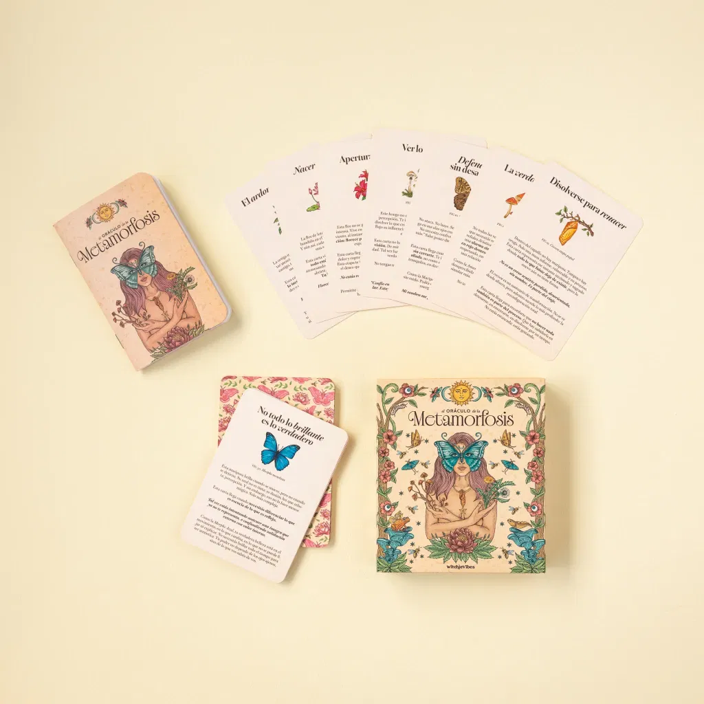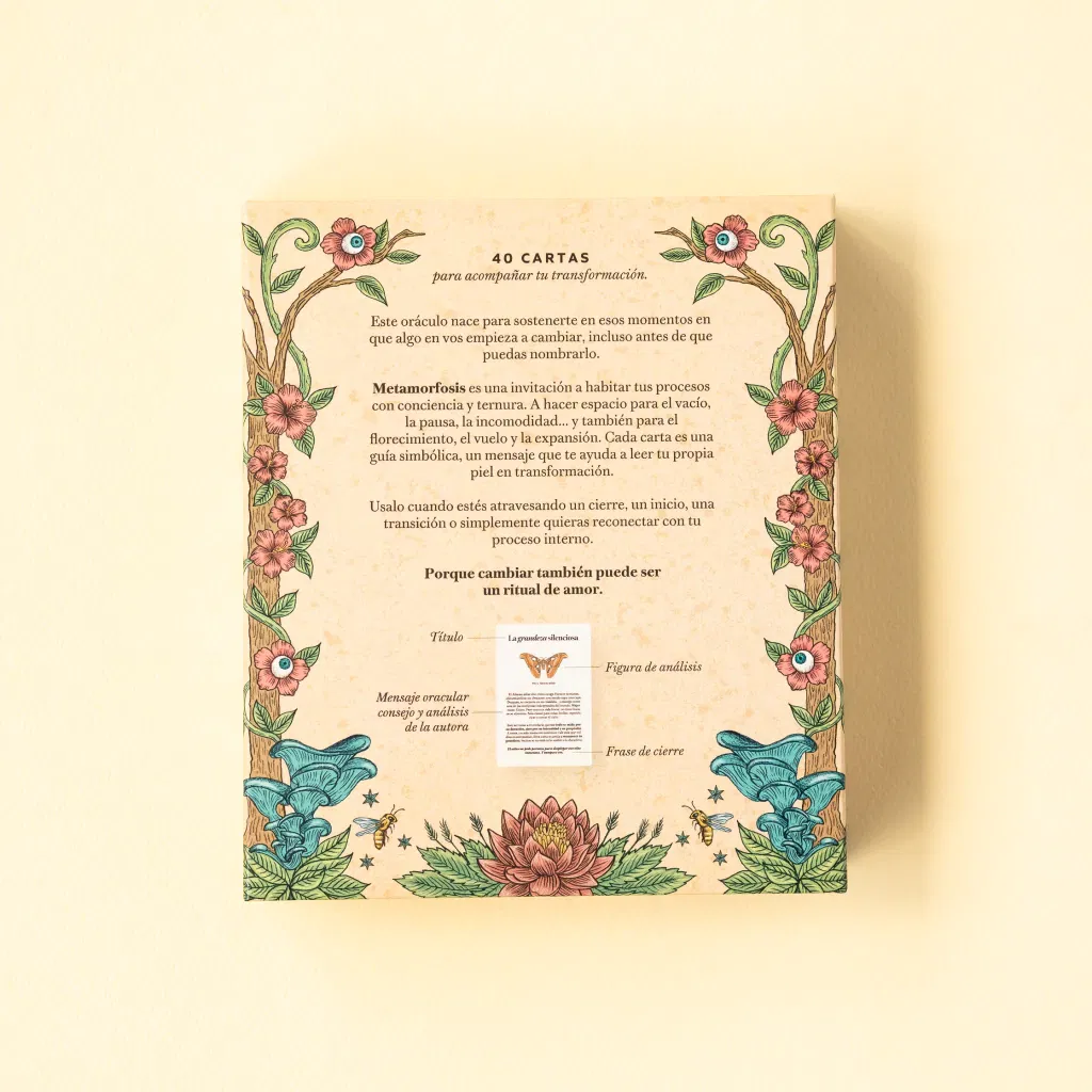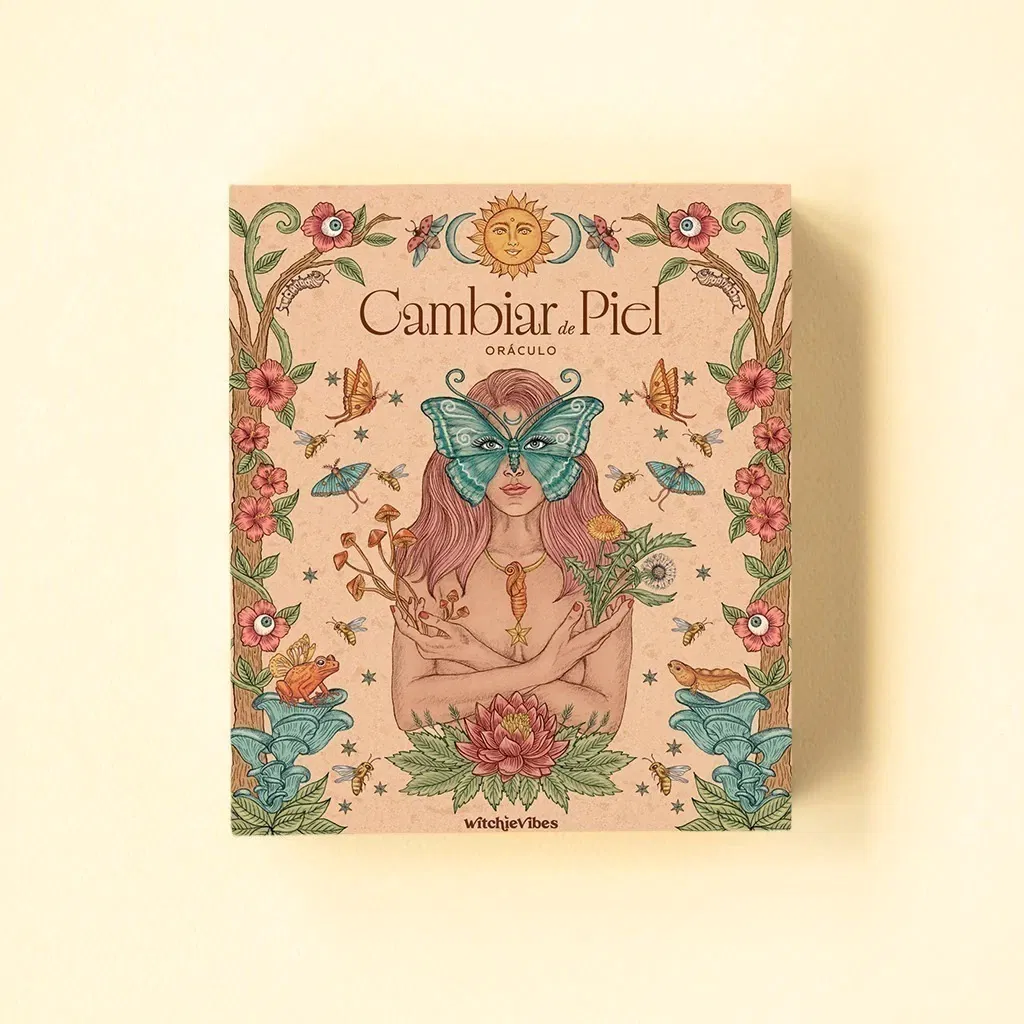 Cambiar de piel - Metamorfosis es un oráculo de 40 cartas ilustradas inspirado en la naturaleza —mariposas, hongos y plantas— que nos enseñan que el cambio no es una excepción, sino el pulso mismo de la vida.