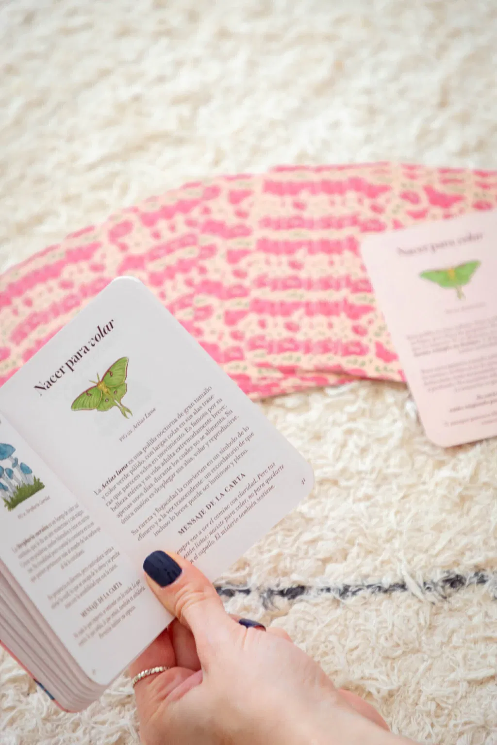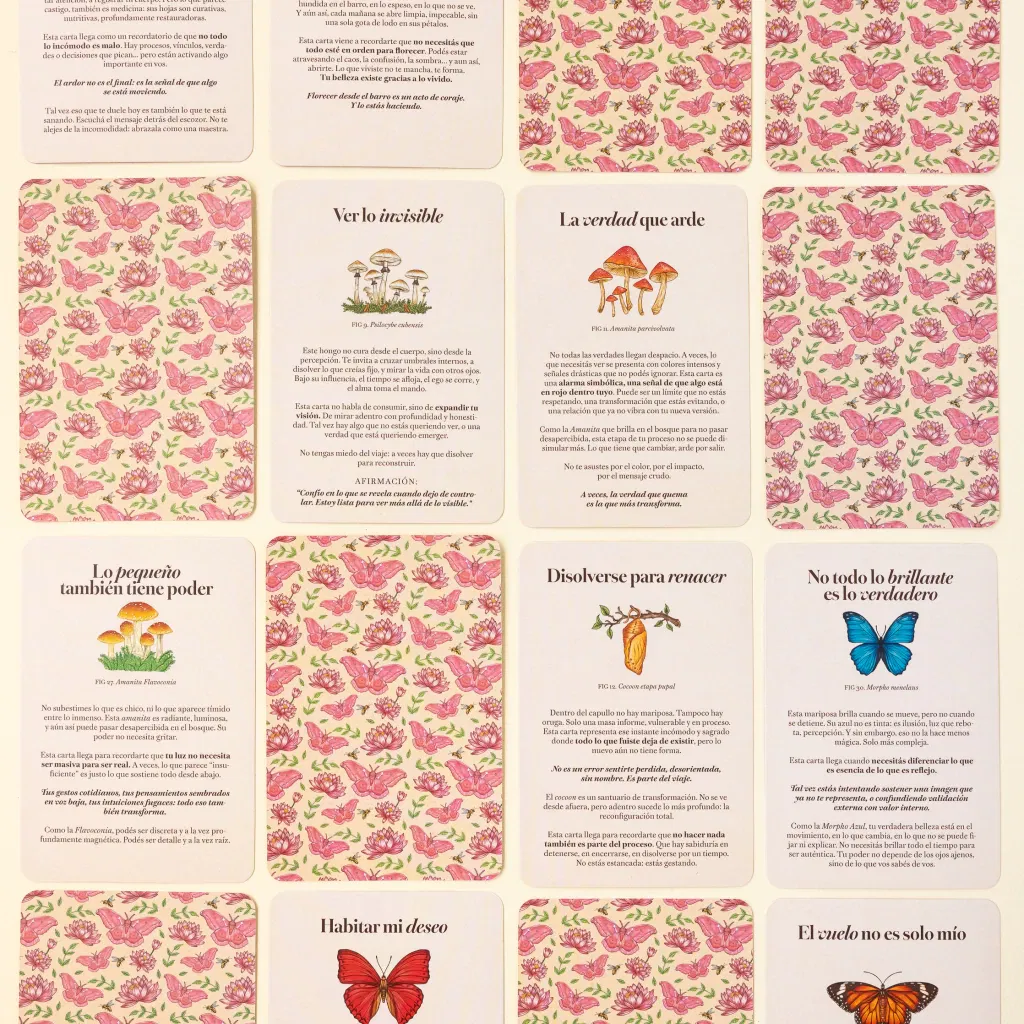 El oráculo incluye además un dossier con información y reflexiones, donde cada animal, hongo o planta despliega su mensaje para ayudarte a comprender y abrazar tus propios ciclos.
