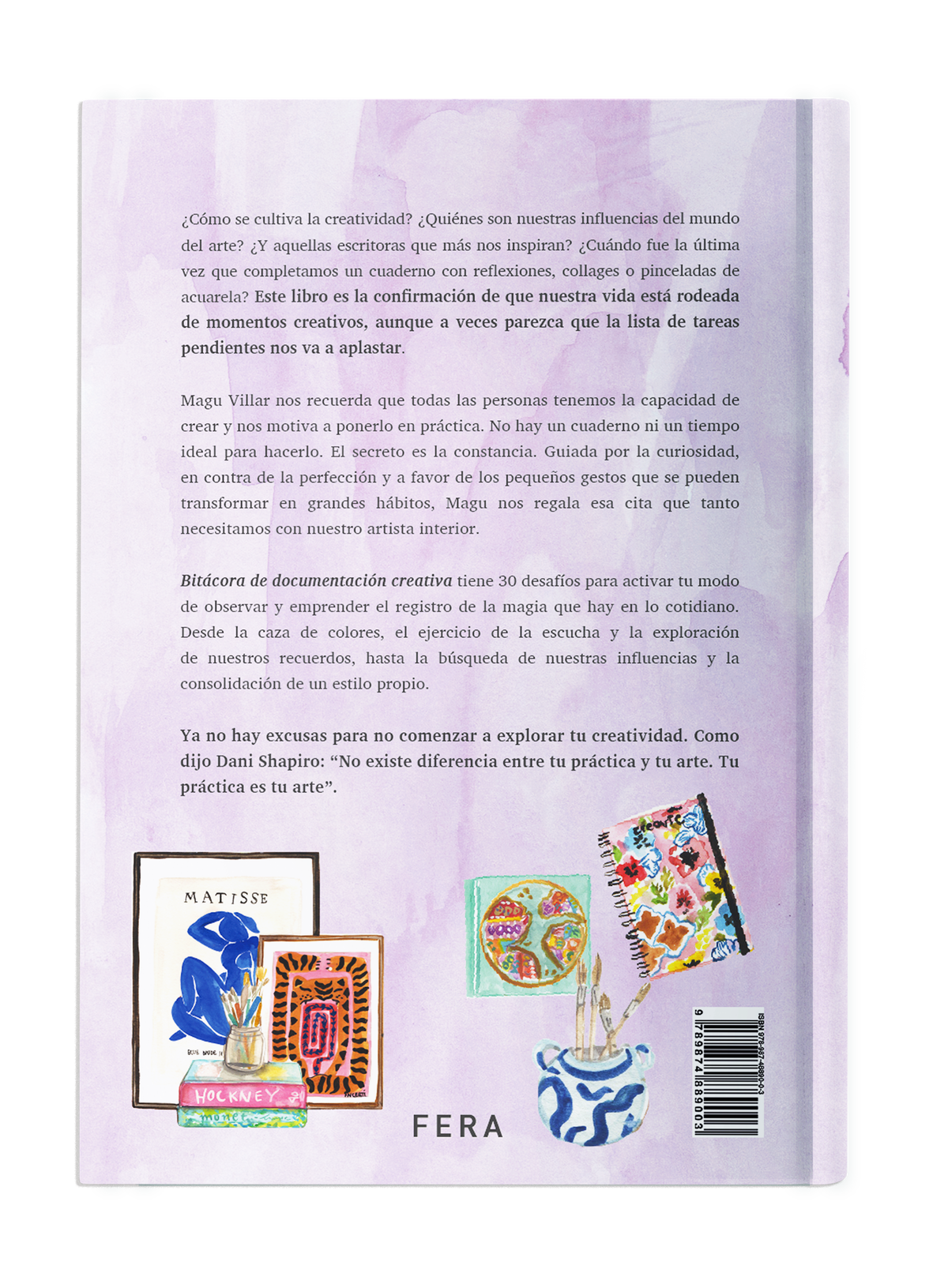 Bitácora de documentación creativa tiene 30 desafíos para activar tu modo de observar y emprender el registro de la magia que hay en lo cotidiano. Desde la caza de colores, el ejercicio de la escucha y la exploración de nuestros recuerdos, hasta la búsqueda de nuestras influencias y la consolidación de un estilo propio. Magu Villar nos recuerda que todas las personas tenemos la capacidad de crear y nos motiva a ponerlo en práctica. No hay un cuaderno ni un tiempo ideal para hacerlo. El secreto es la constancia.