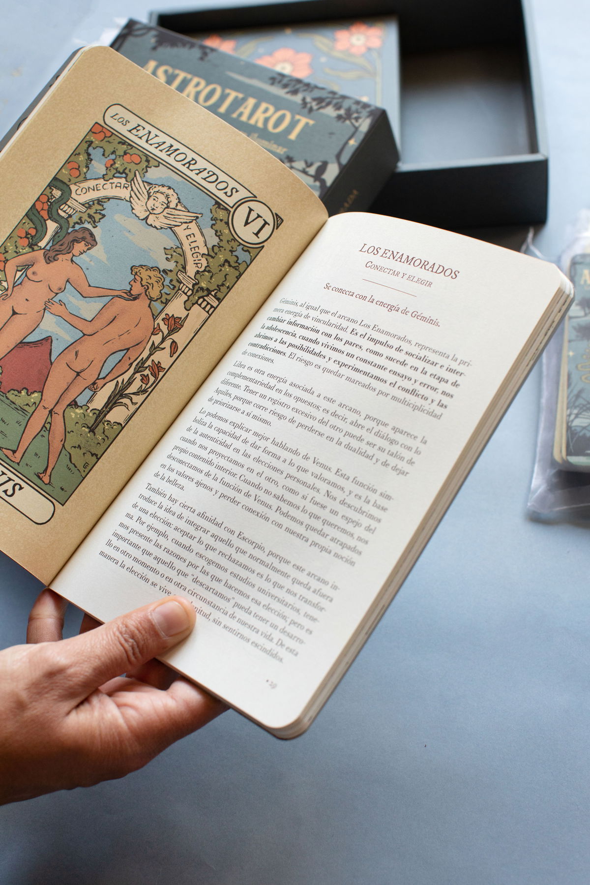 - Un libro con descripciones de las 78 cartas y su conexión astrológica.