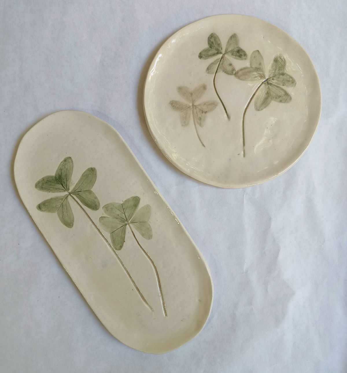 Hecho en cerámica con impresión botánica de trébol, único y artesanal. Medidas: 26,5 cm de largo x 12 cm de ancho. Ideal como plato decorativo, porta velas o despojador funcional.