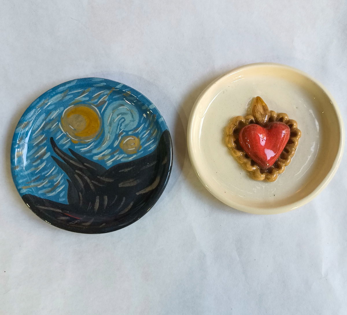 Pieza única, hecha y pintada a mano. Diseño inspirado en la noche estrellada, ideal como platito decorativo, despojador, porta velas o para tus cristales. Mide aprox. 10,5 cm de diámetro. Una mini obra artesanal para sumar un toque especial a cualquier rincón.