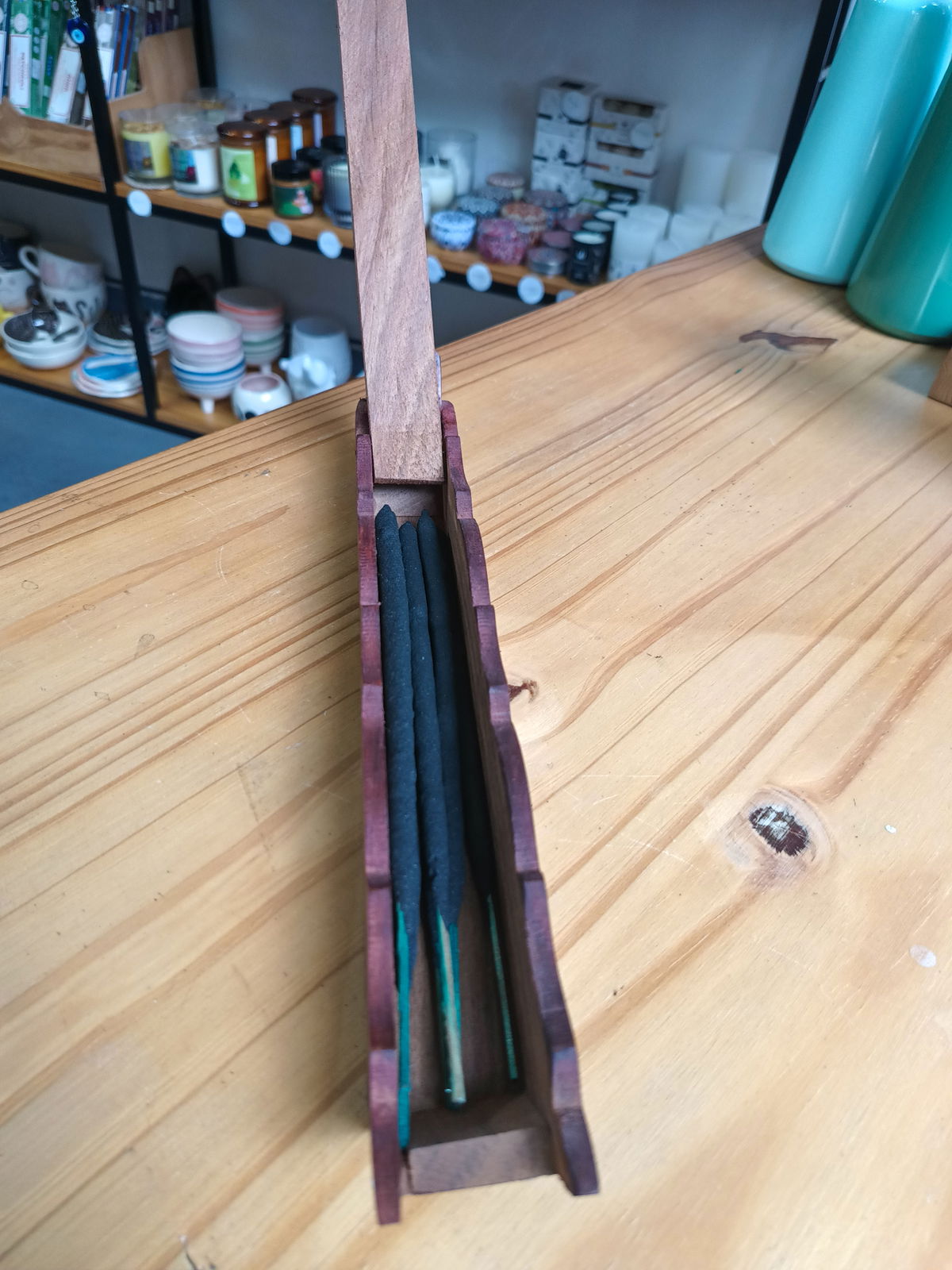 Funcional y hermoso: un portasahumerio tipo cajita donde podés guardar tus sahumerios adentro. Hecho en madera, práctico y prolijo para mantener todo ordenado y listo para usar. Ideal para quienes buscan estética, comodidad y un accesorio duradero para sus rituales.