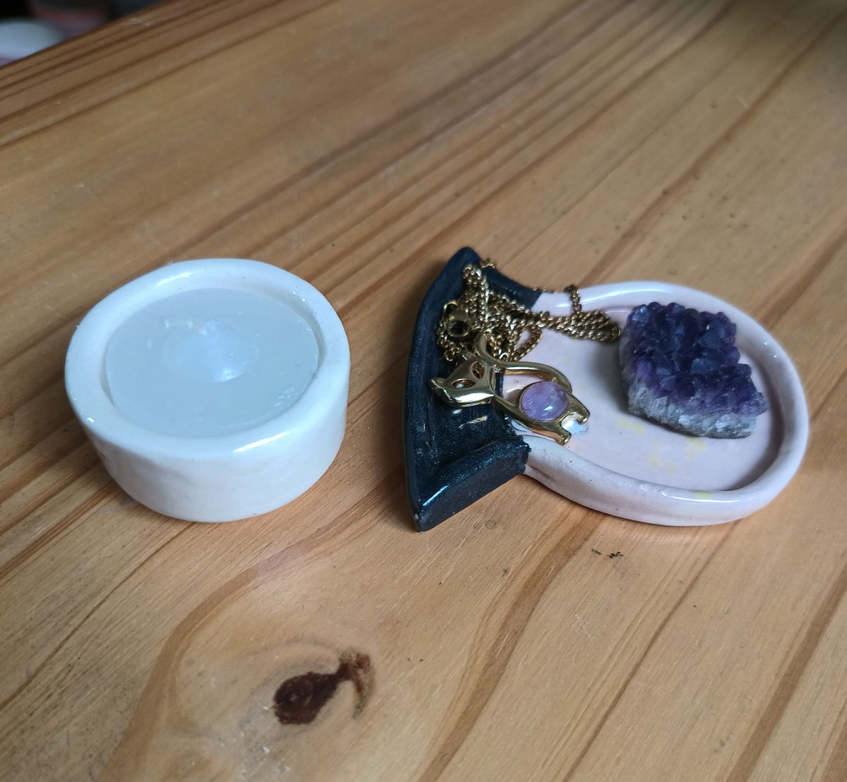 Hecho a mano en cerámica. Podés usarlo como portavela o como despojador. Versátil, práctico y perfecto para sumar luz y energía limpia a tu espacio.